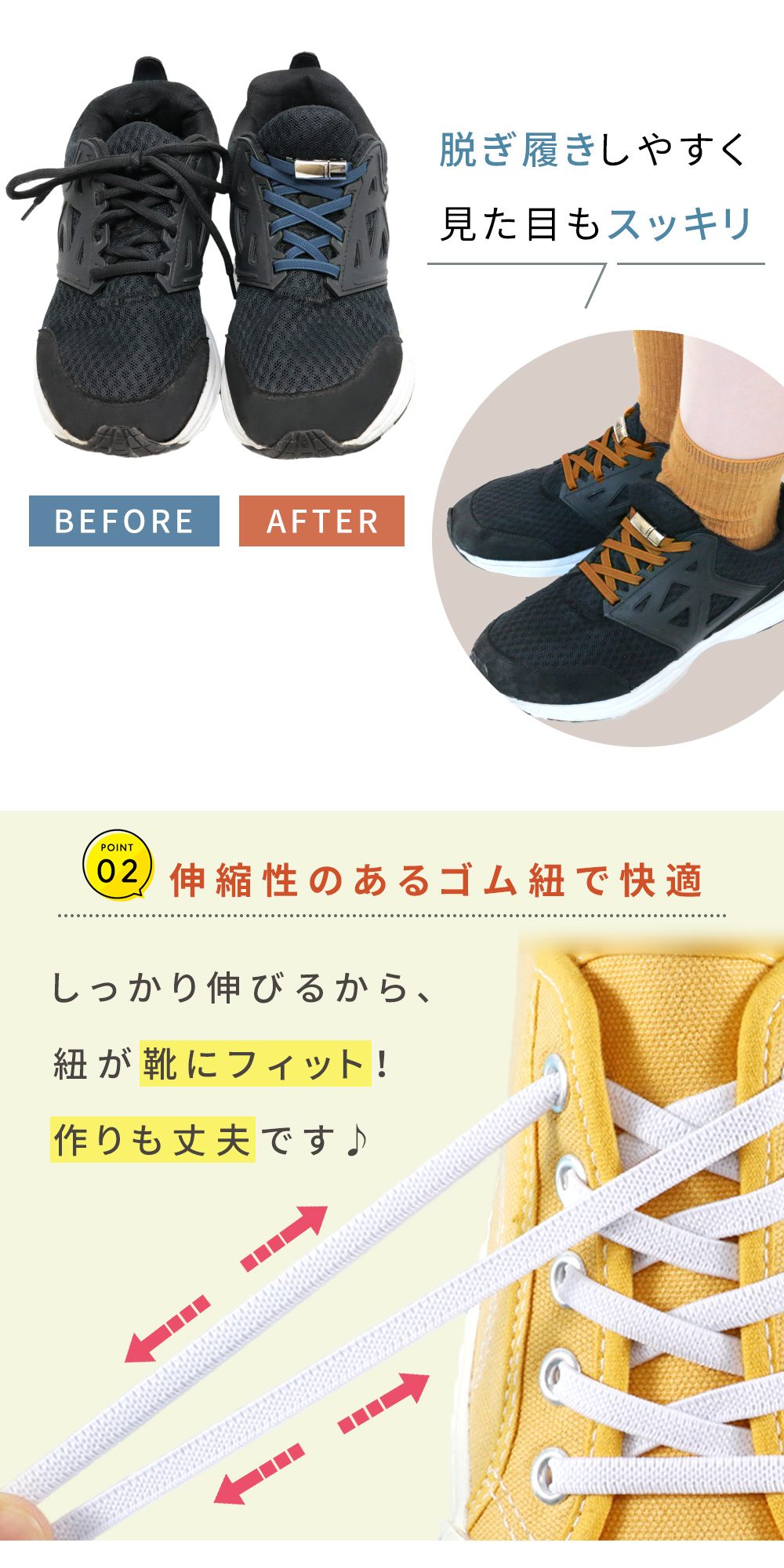 伸縮性のあるゴム紐だから脱ぎ履き楽チン♪