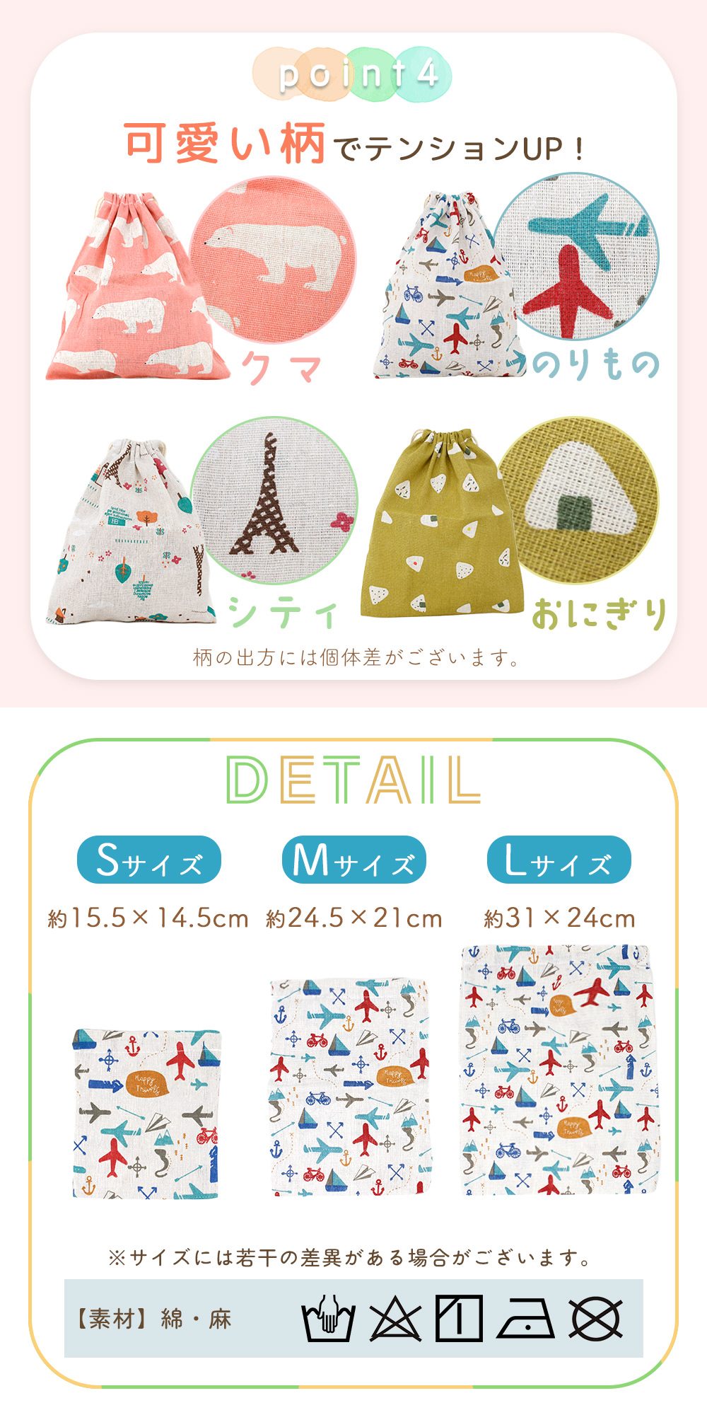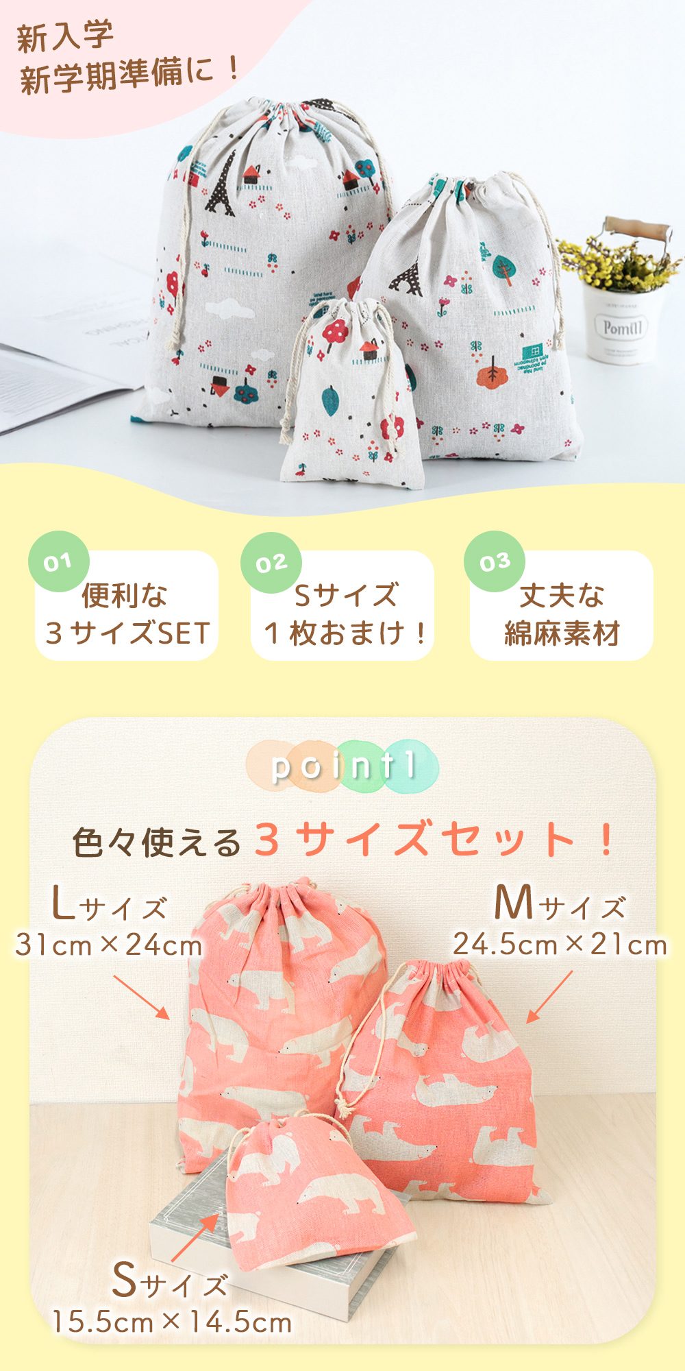 使い勝手のいいサイズの異なる巾着3枚セット