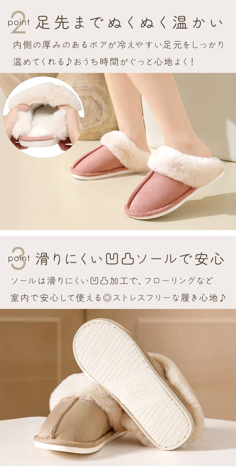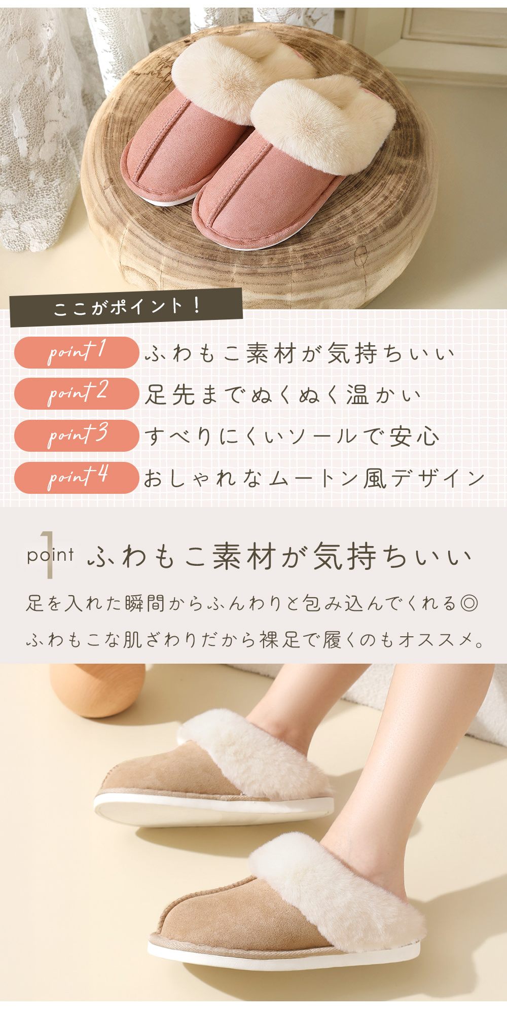• ふわふわのファーが足全体を優しく包みます
