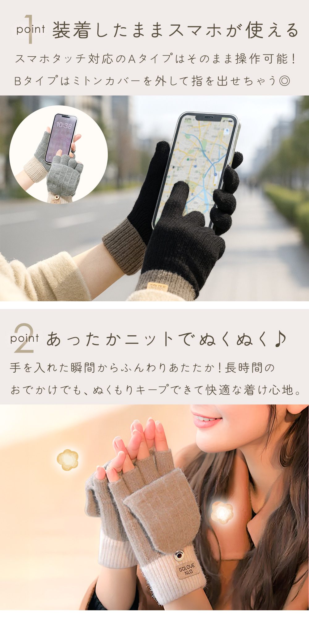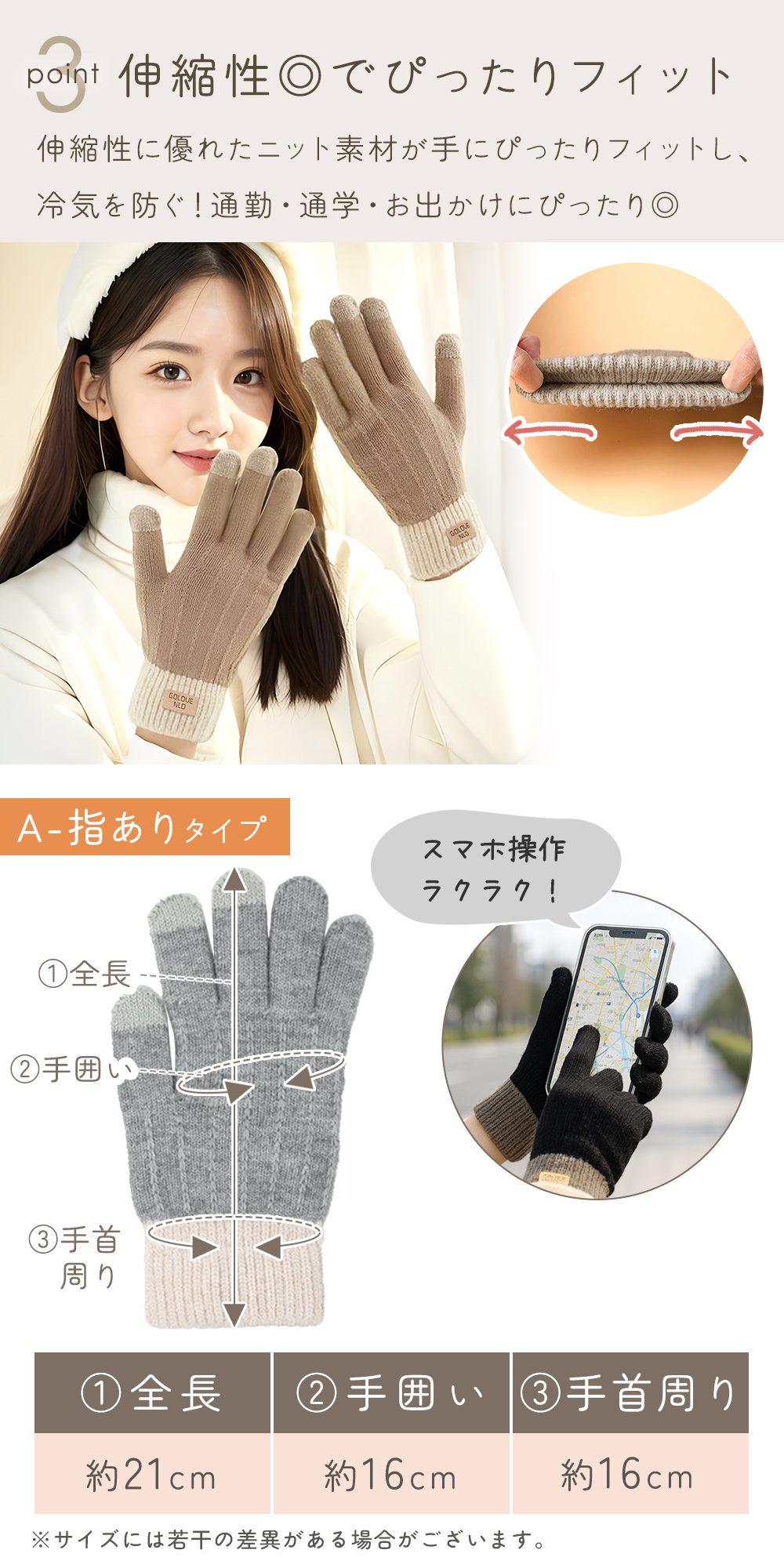 • 手袋を着けたままスマホが使えて便利