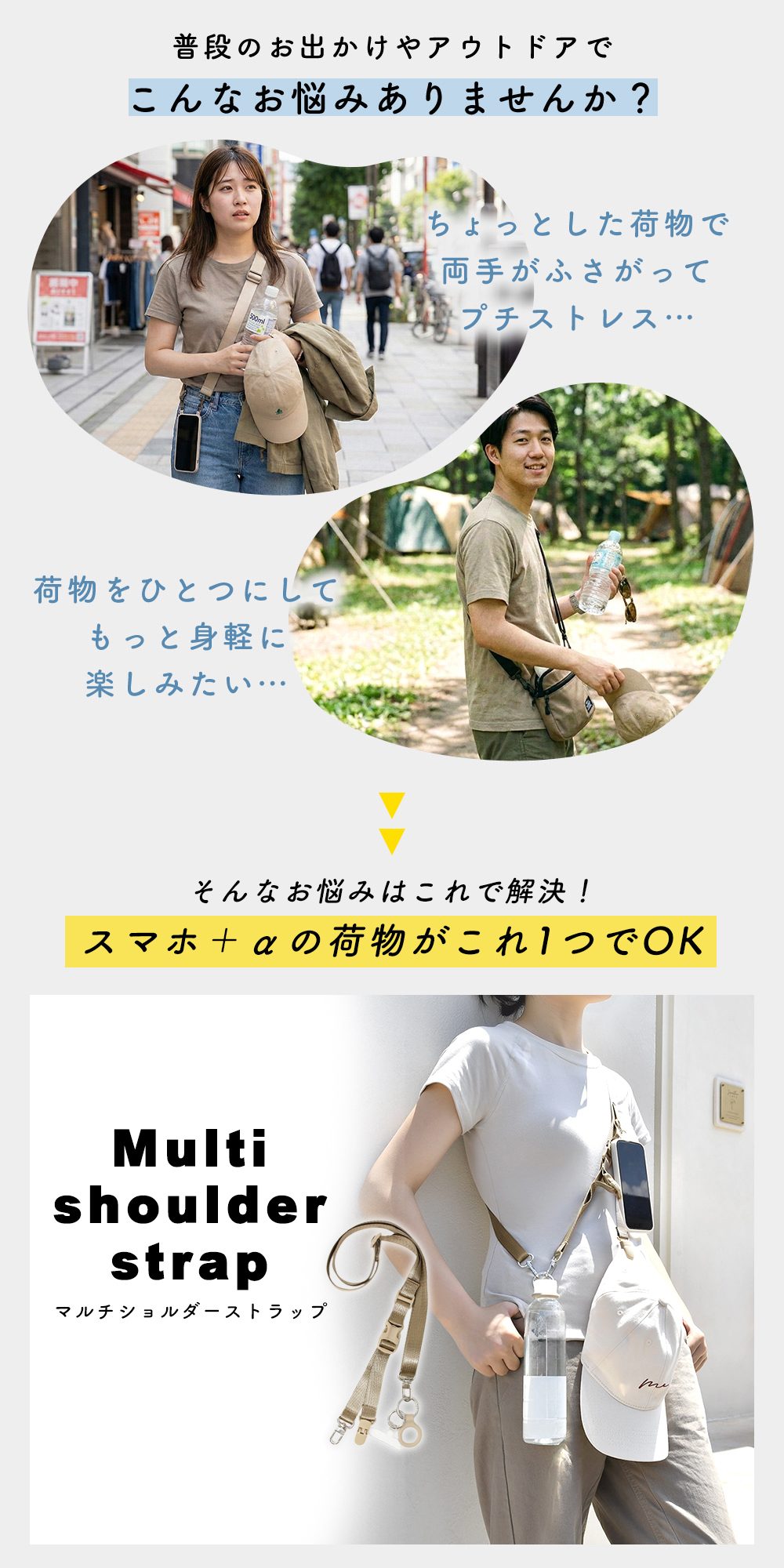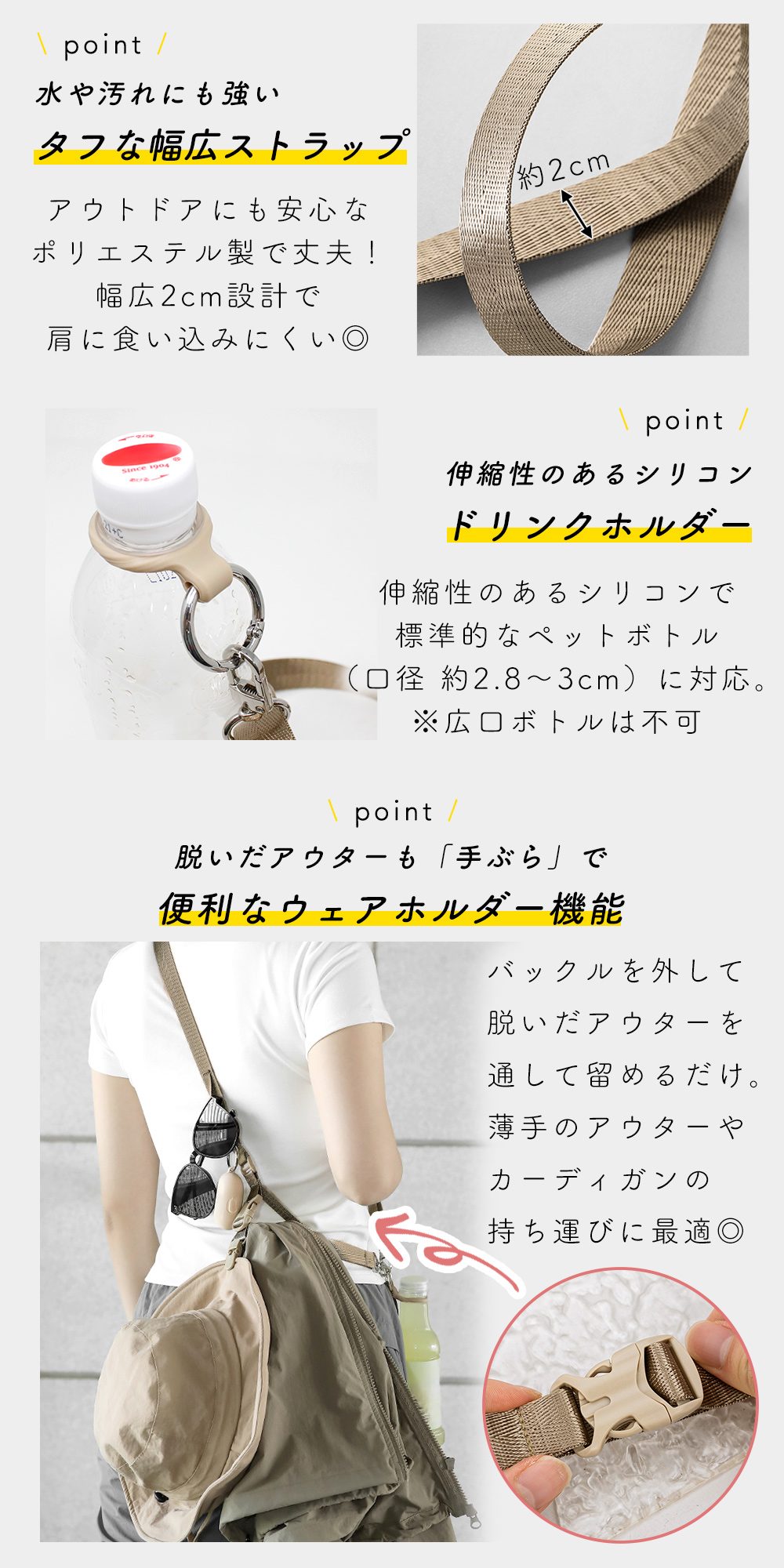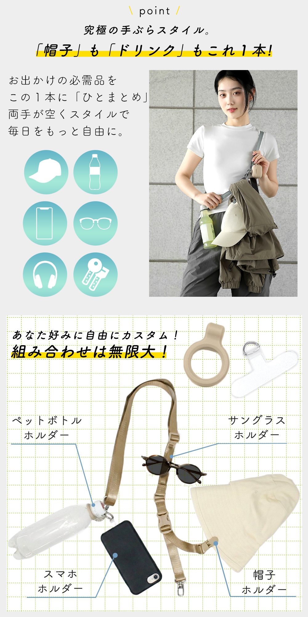 これ1本でスマホから飲み物、帽子、上着まですべて持ち運べる優れもの