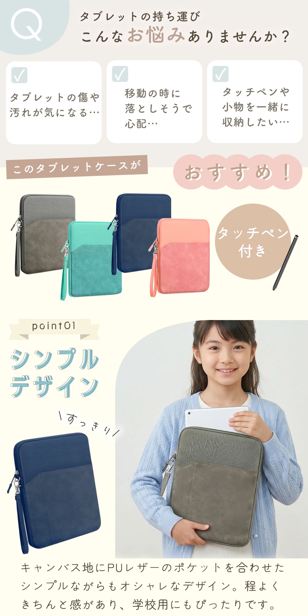 シンプルなデザインで学校のタブレットケースに最適