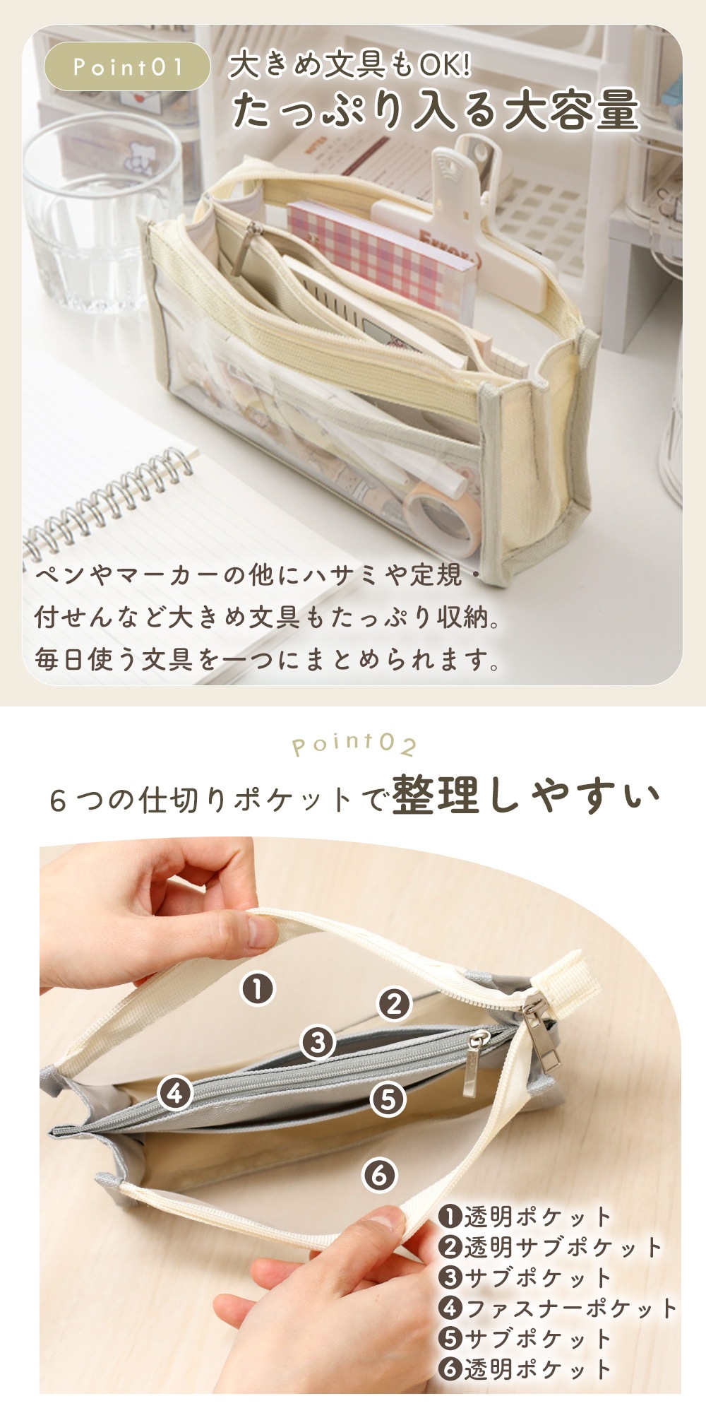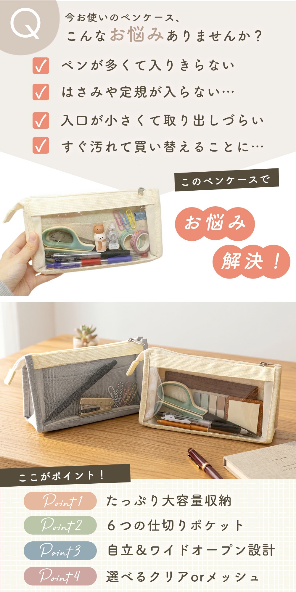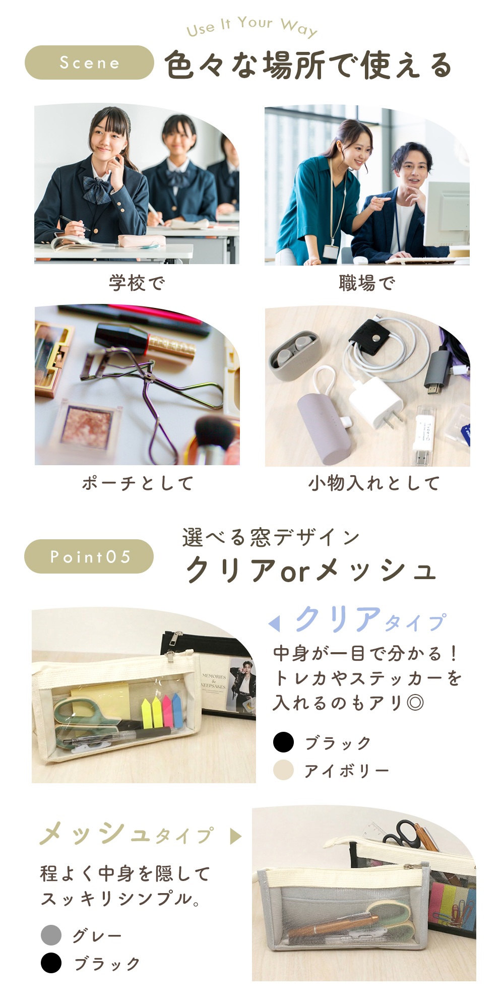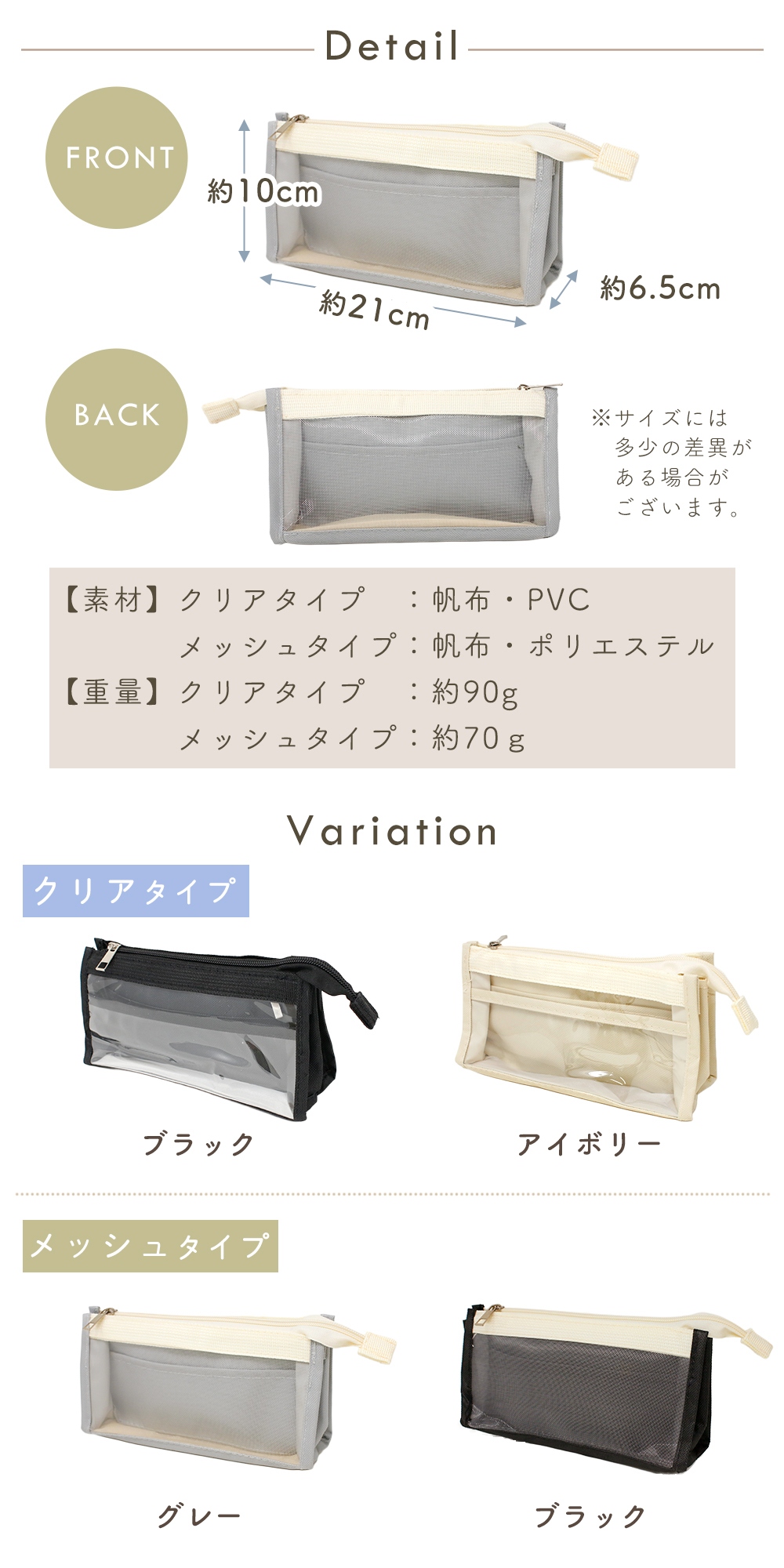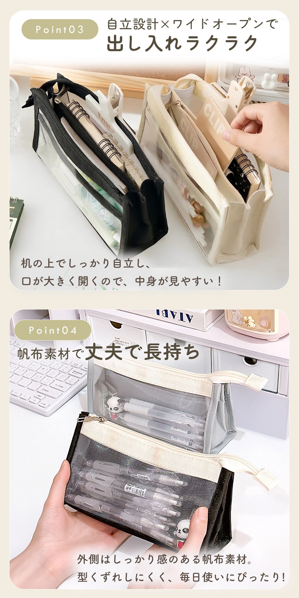 クリア・メッシュ素材で中が見えてわかりやすい。